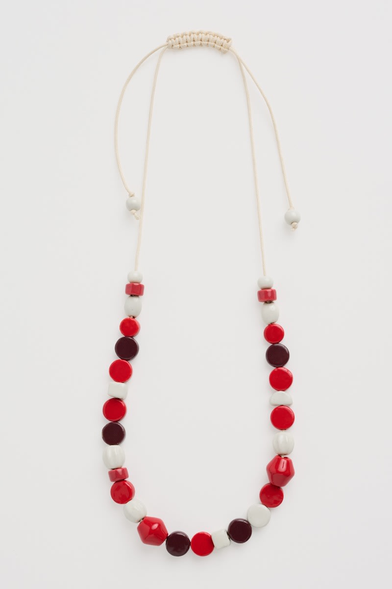 Complete your outfit with a splash of colour. Our Serravezza necklace features a blend of ceramic beads in rich colours and organic shapes. The mixed beads are threaded onto a cotton cord, which can be adjusted to your favourite length. The cord is finished at the back with a pair of little beads.