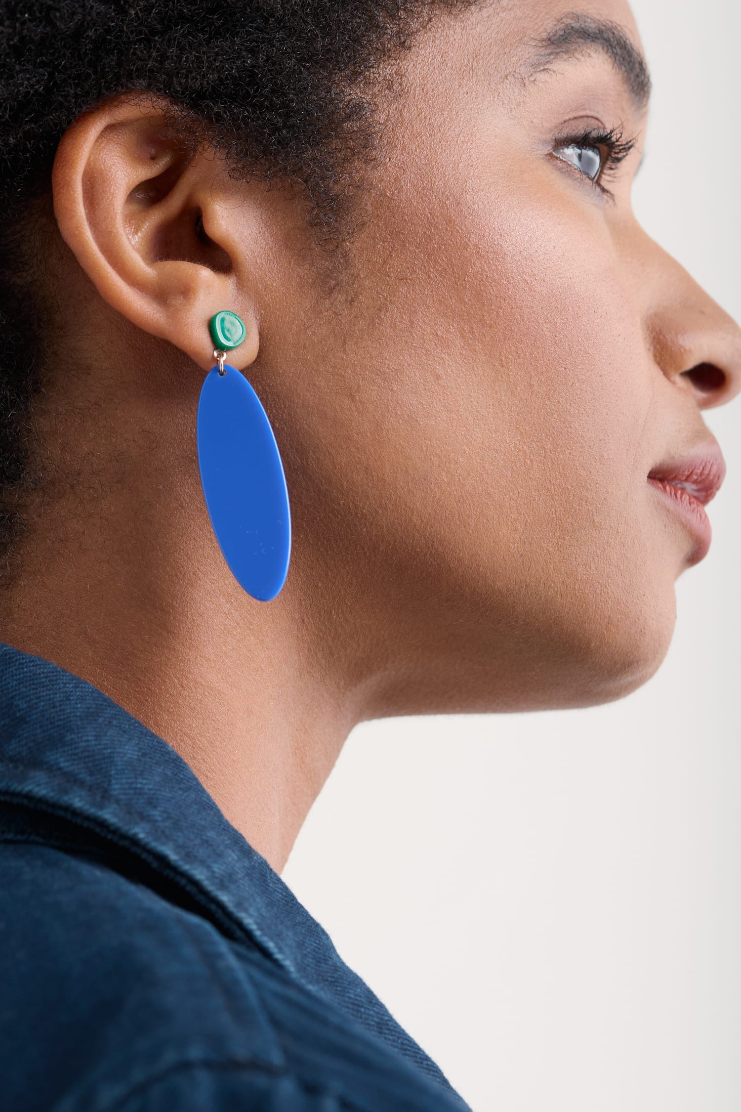 We love the easy swaying movement of these elegant, sculptural drop earrings. The stud fastening and long drop bead are made from marbled resin for lovely depth of semi-opaque colour. Versatile and effortless.