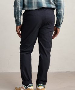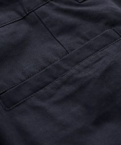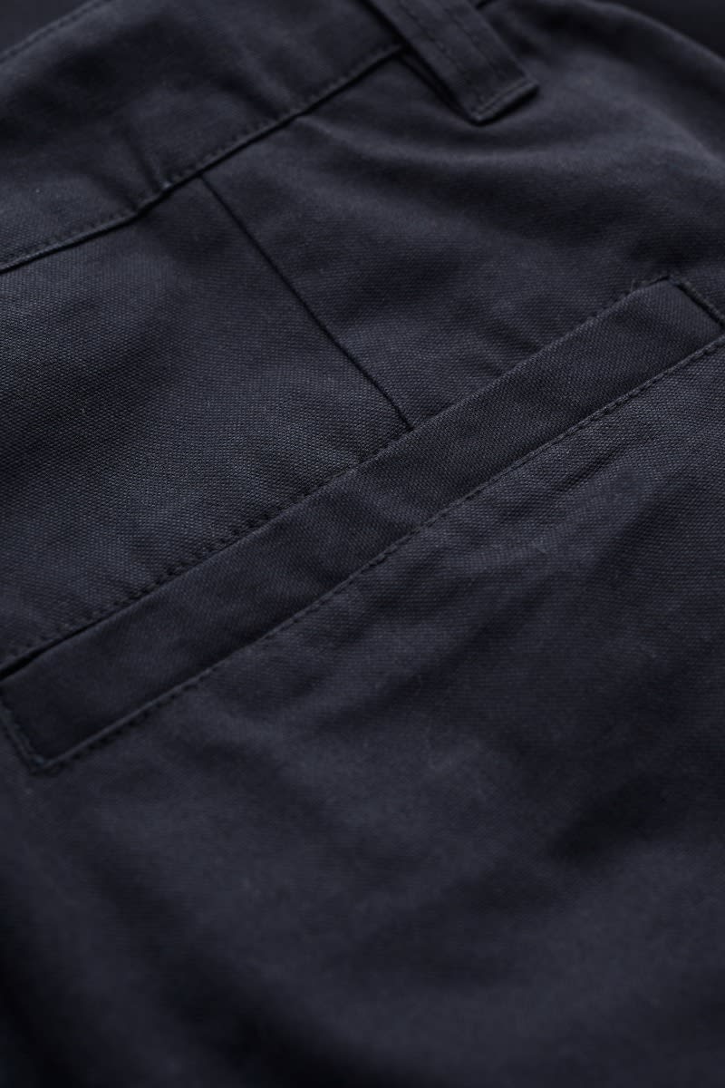 Slightly tapered trousers crafted from durable organic cotton with practical heritage details. Small elastic inserts in the inside waist give a comfortable flex to the fit, and a handy coin pocket is positioned on the hip beside the angled pocket.