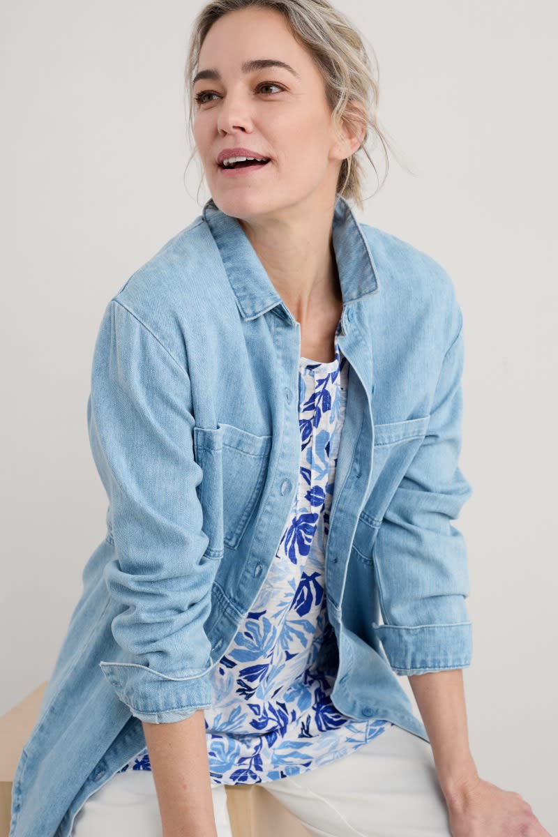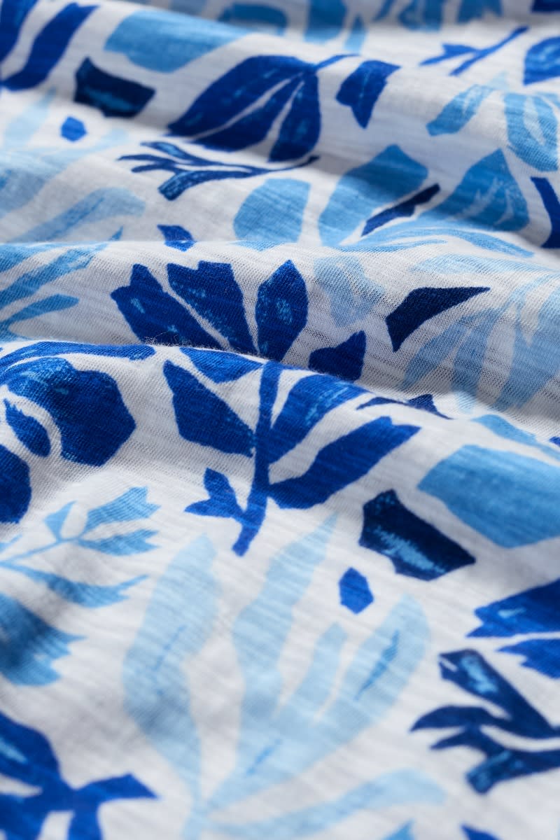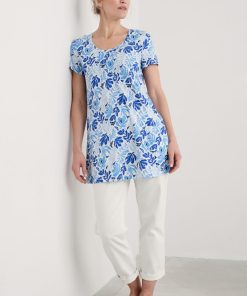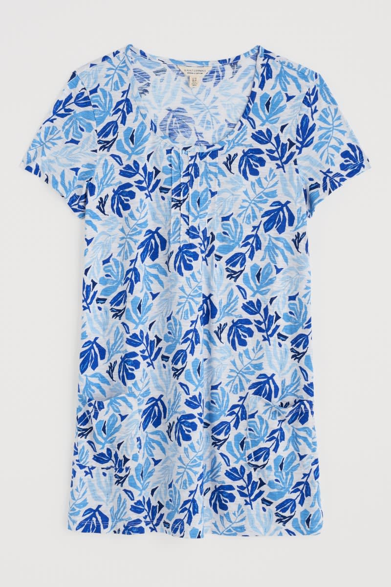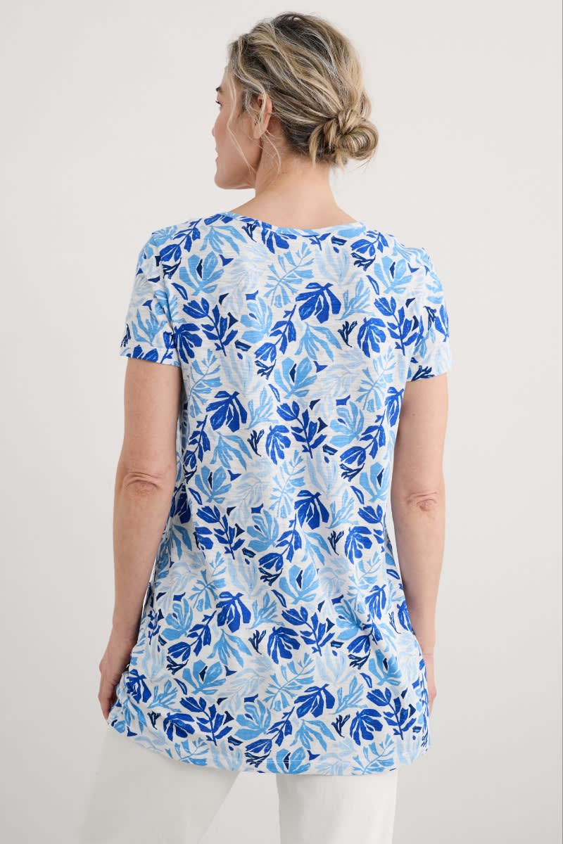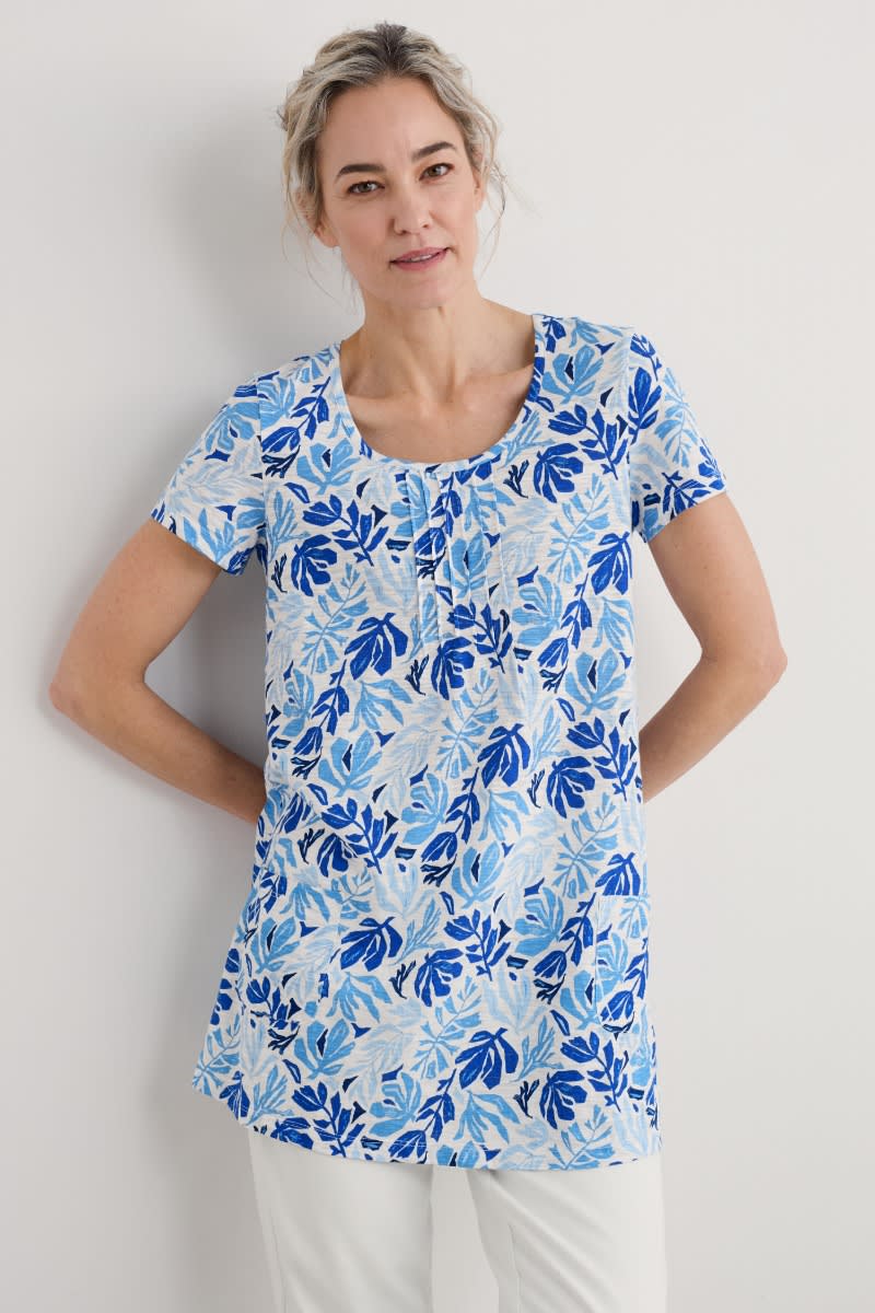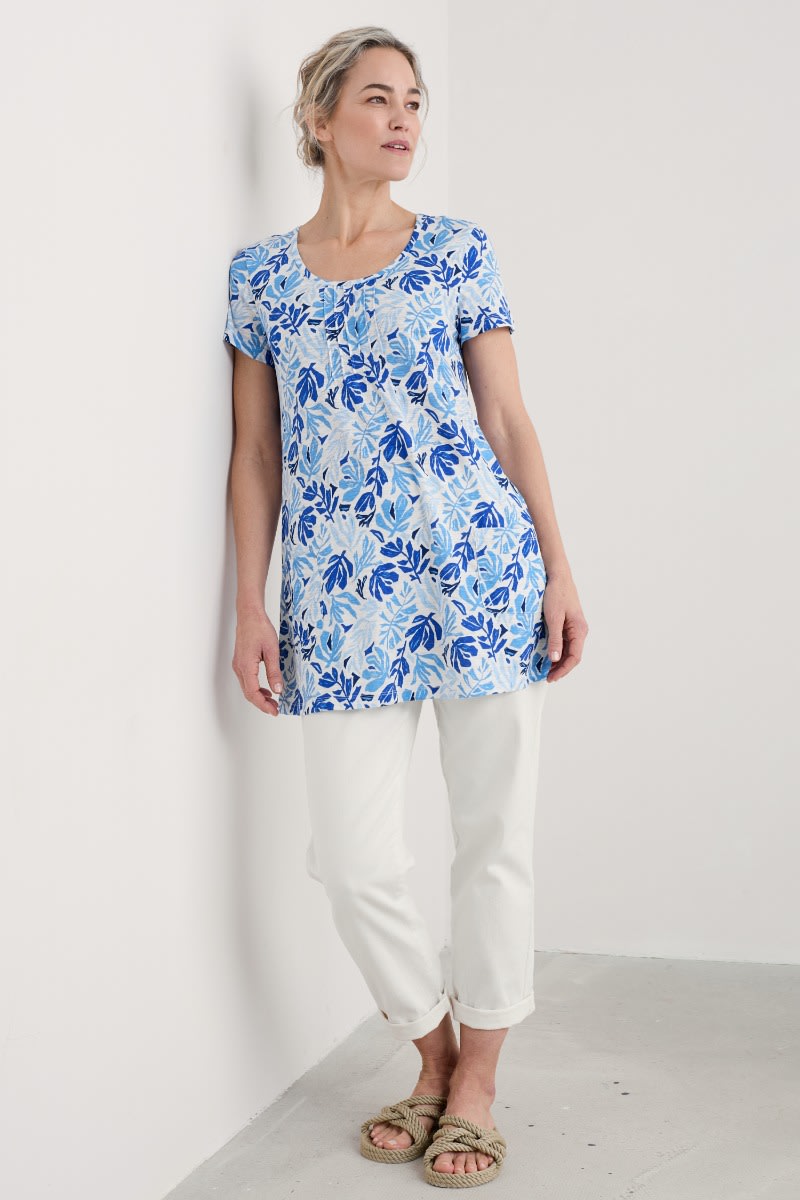 A short-sleeved tunic, in soft organic cotton slub jersey. Our Busy Lizzy Tunic has a flattering scoop neck, pintuck detailing on the front and two patch pockets. A shorter length tunic which looks great layered over crops with a pair of colourful leather sandals.