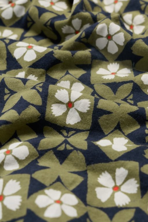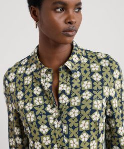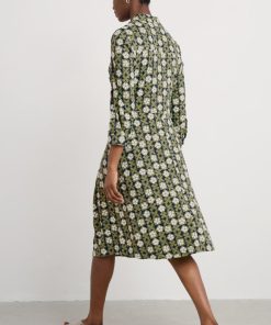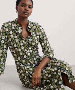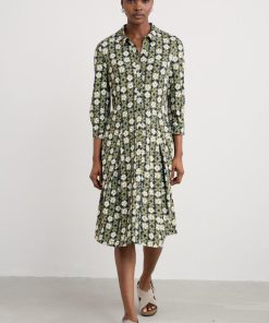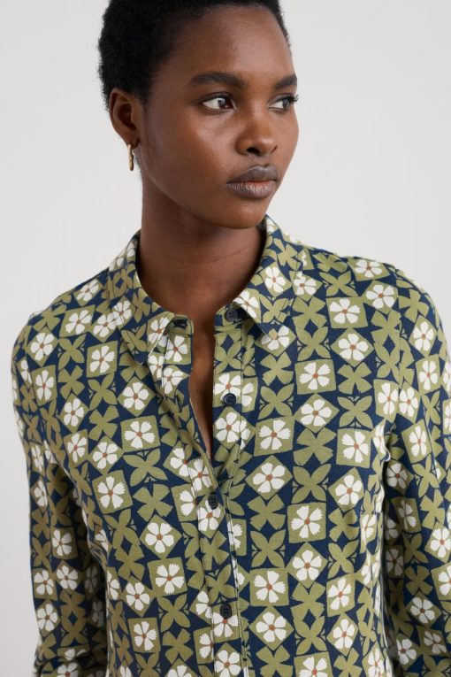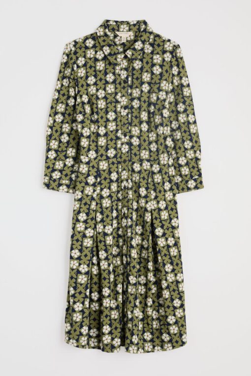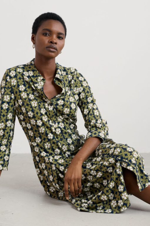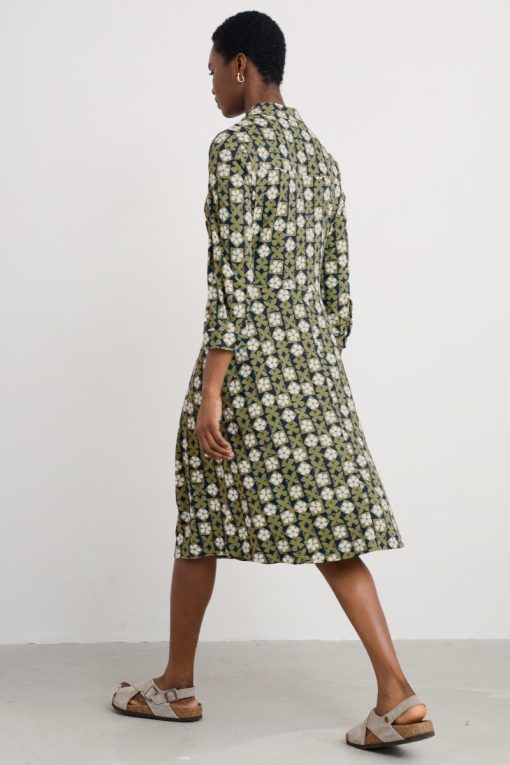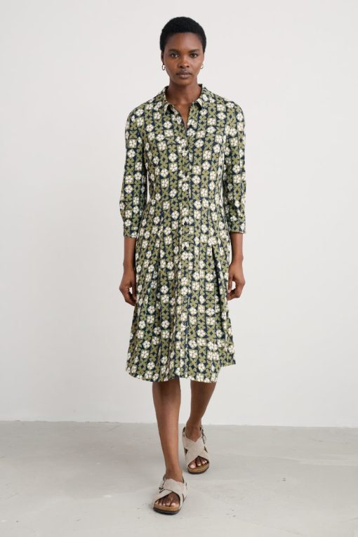 A jersey shirt dress in a soft organic cotton and modal blend. The shirt style bodice features a collar, button details and 3/4 length sleeves. The knee-length skirt is given movement with a pleat on each side. Available in a selection of storytelling Seasalt prints.