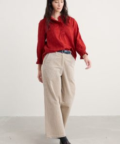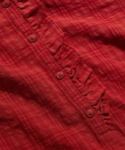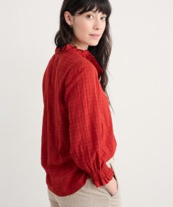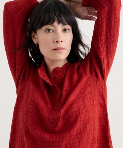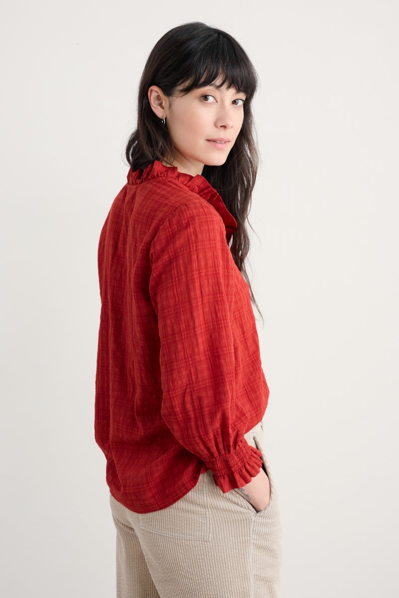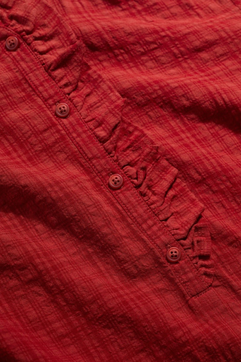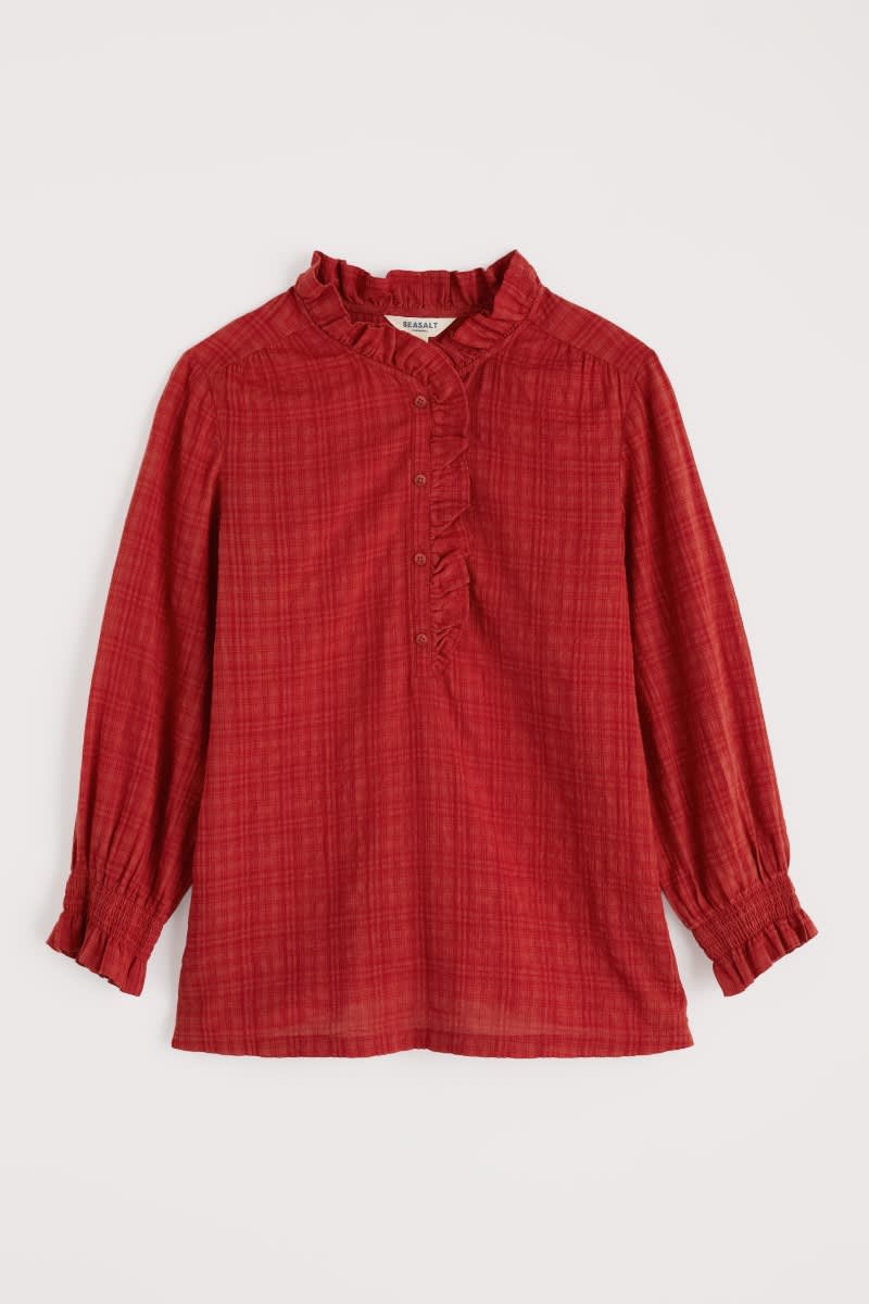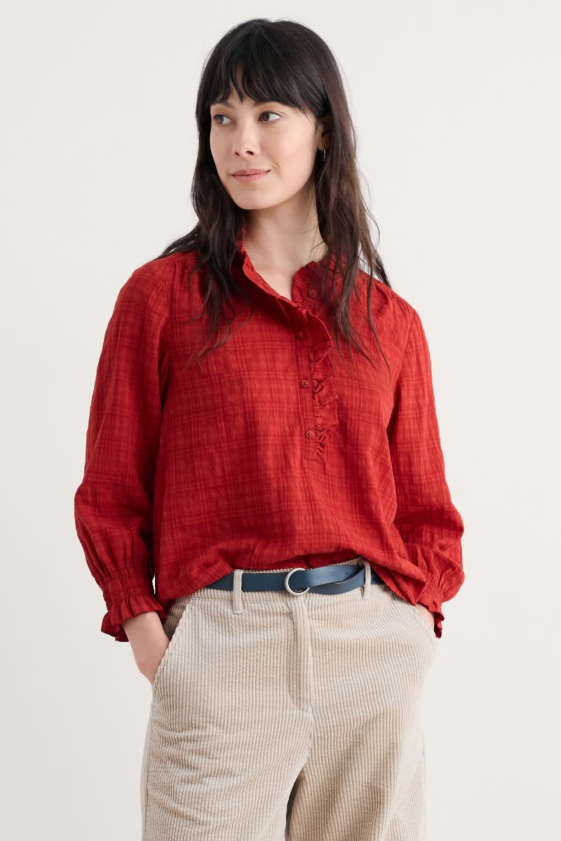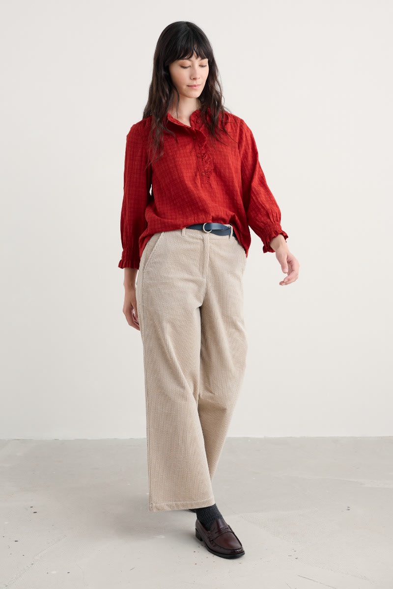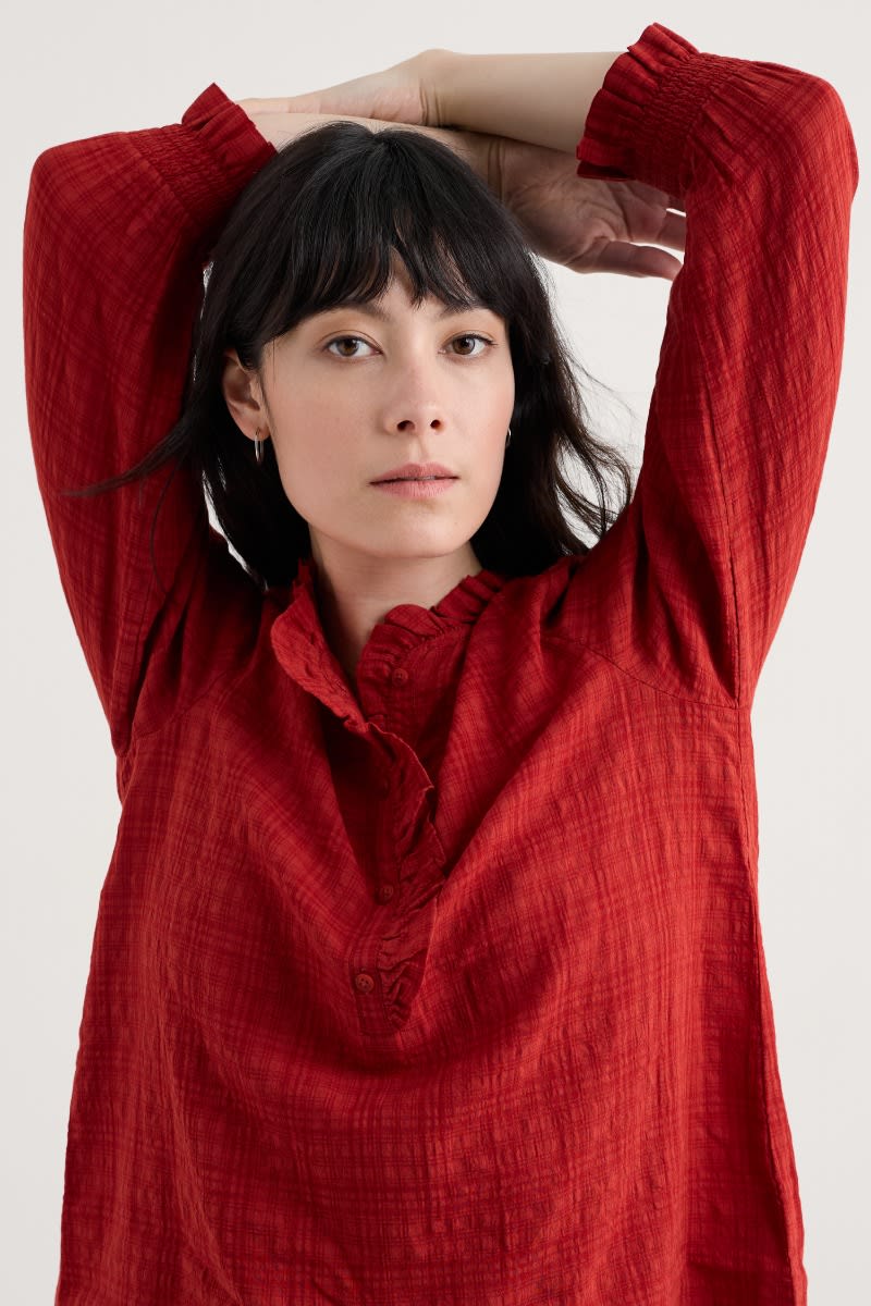 A versatile top made from a lightly textured blend of organic cotton and LENZING™ ECOVERO™ viscose, with a tonal check. Elasticated cuffs have a playful frill, echoing the frill around the button-down half placket. The easy fit is perfect for tucking in, wearing loose or under pinafores, and is created with delicate gathers from the yoke.
