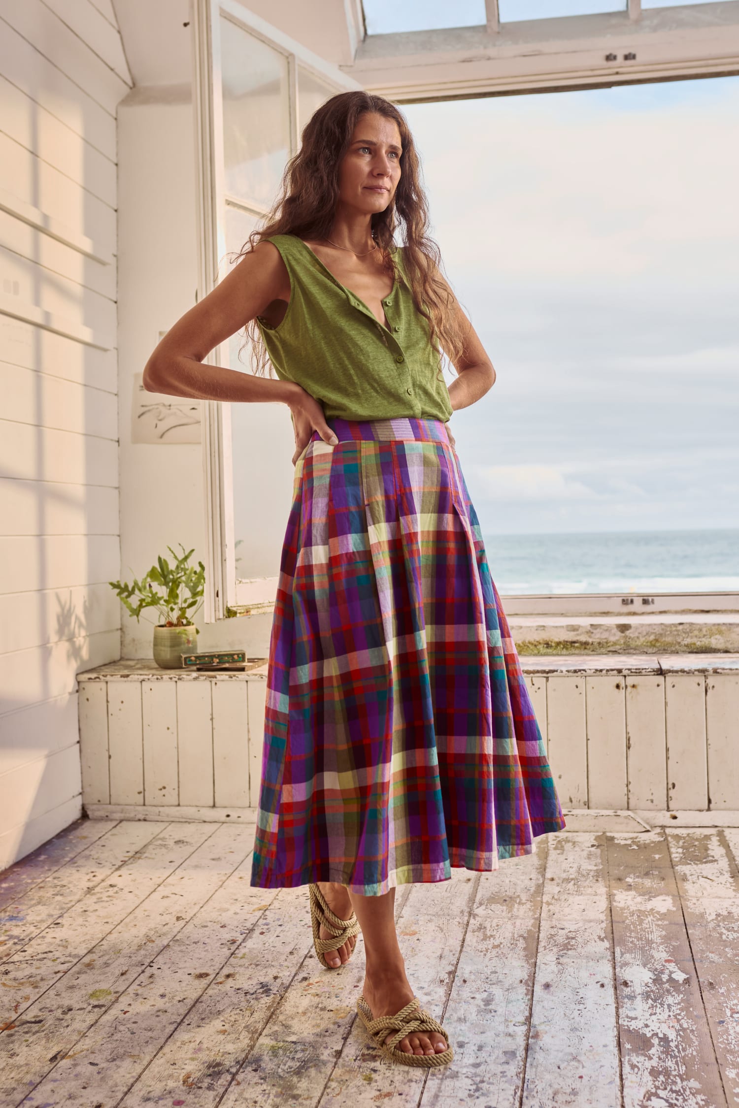 Woven from soft cotton chambray, our Jamboree Skirt feels silky and cool against the skin. We’ve given this midi length style soft pleats for plenty of movement, so it’s full and floaty with a flattering waistband and concealed side zip. We like it best with a simple organic cotton top.