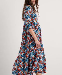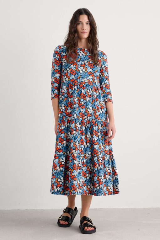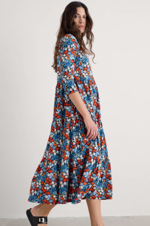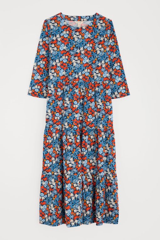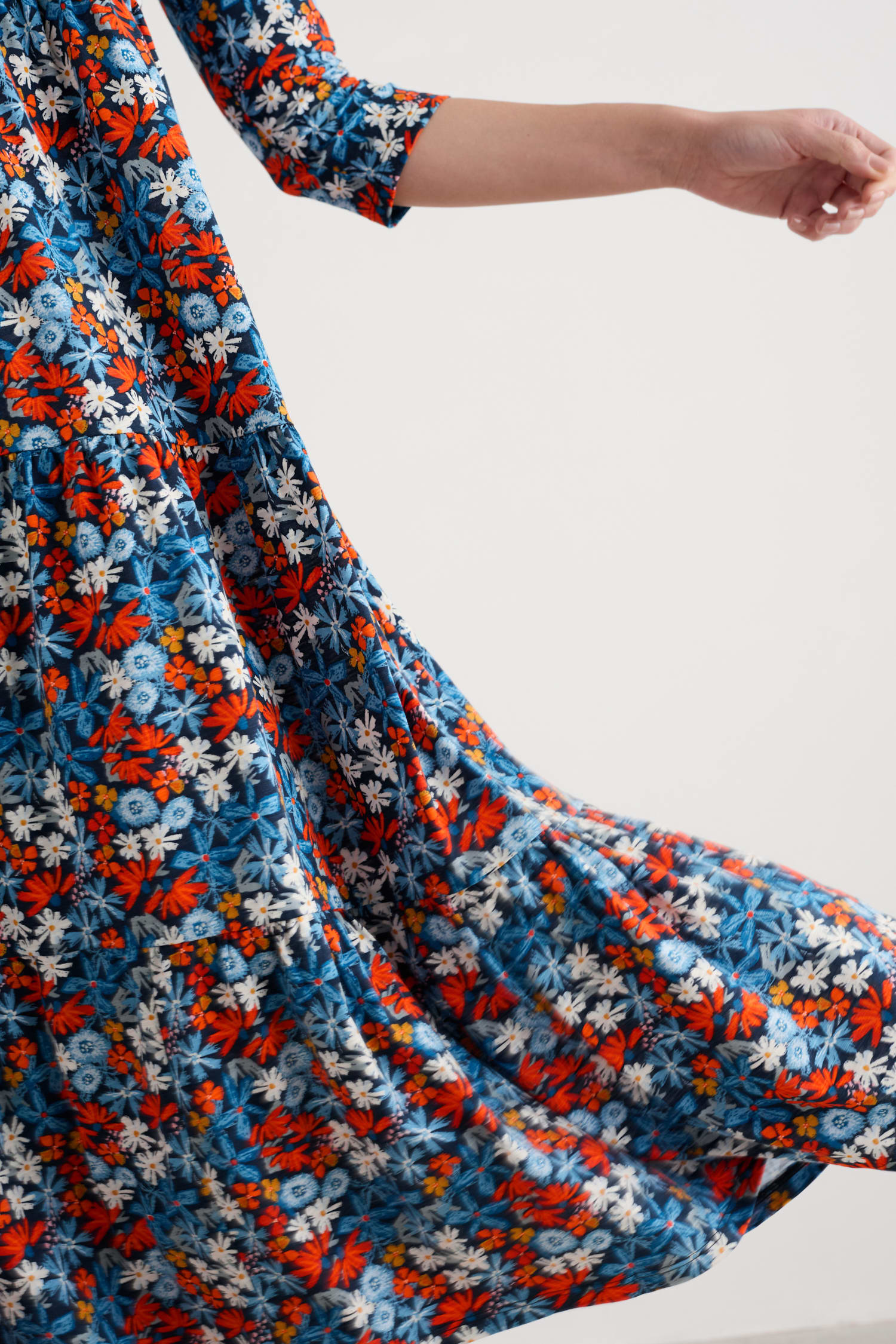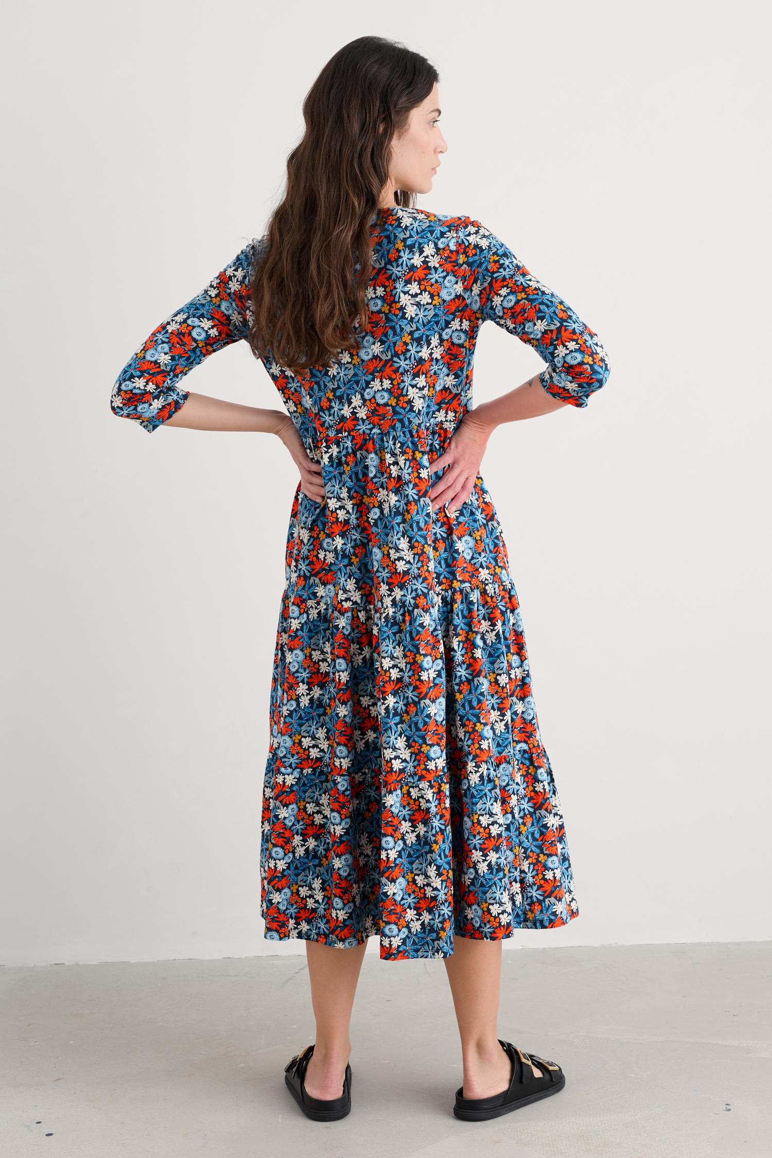 A relaxed fit, feminine dress with three floaty tiers finished with soft gathers, giving it a gorgeous swish. Made from breathable, easy to wear cotton jersey in a rich colour or delicate handcrafted print, with 3/4 length sleeves and a round neck.