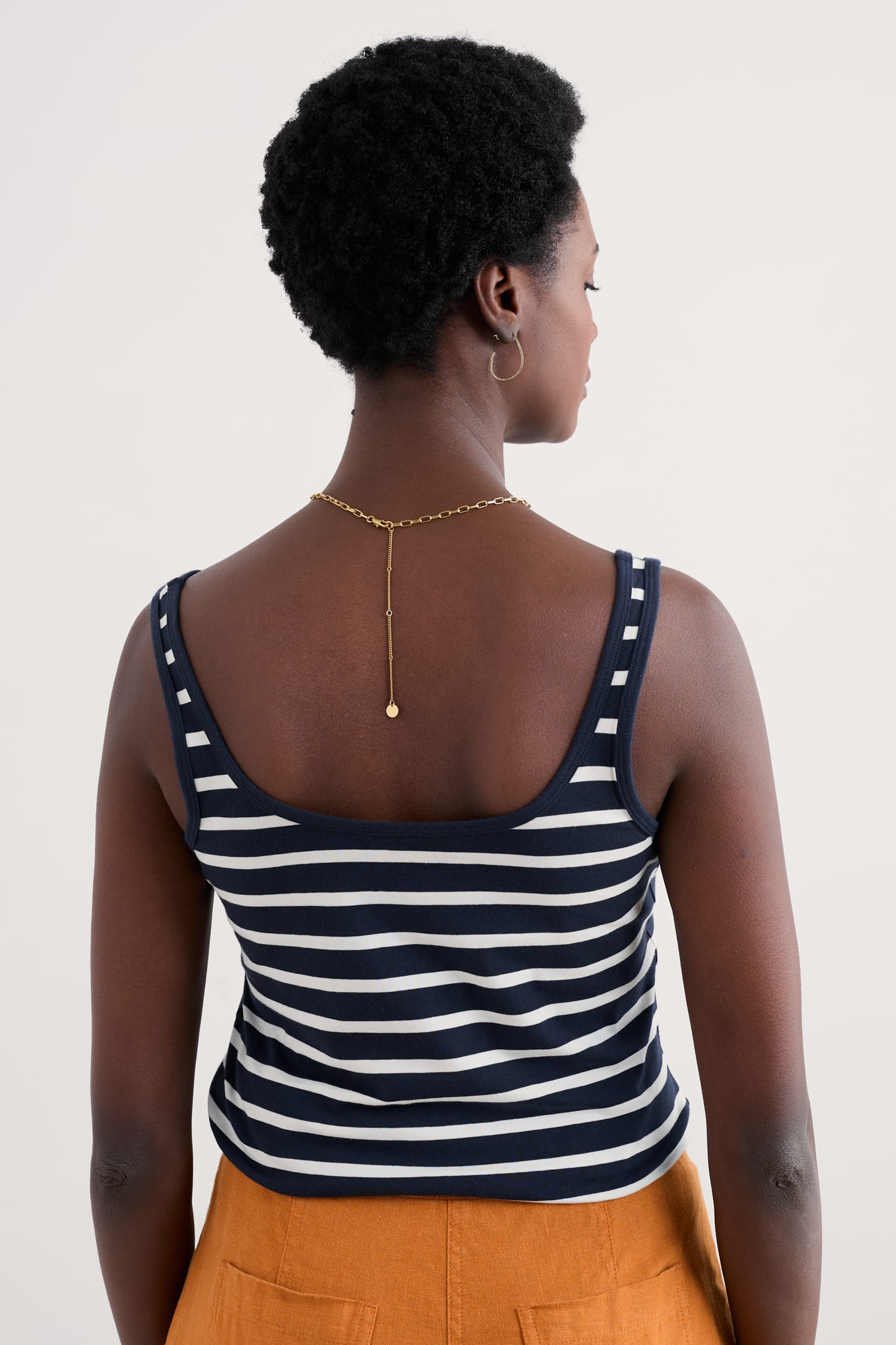 A simple scoop neck vest in soft, breathable organic cotton jersey with a little bit of stretch. A summer basic that you can layer under our crinkled cotton Larissa Shirts or pair with a statement skirt on high summer days.
