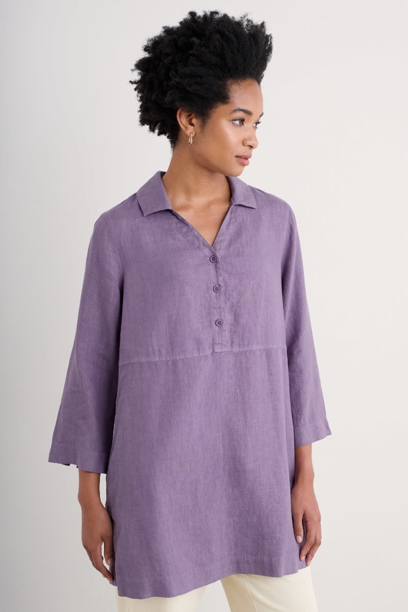 Airy and relaxed, our mid-length Early Sun Tunic is woven from 100% linen. Designed to get better with every wash and wear, we’ve given this timeless style bracelet-length sleeves, a relaxed collar and V-neck, as well as a simple box pleat to the back to lend the body a gentle swing. The hem is finished with deep vents at the side with heritage-inspired bar tack stitches for longevity.