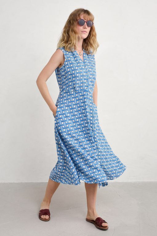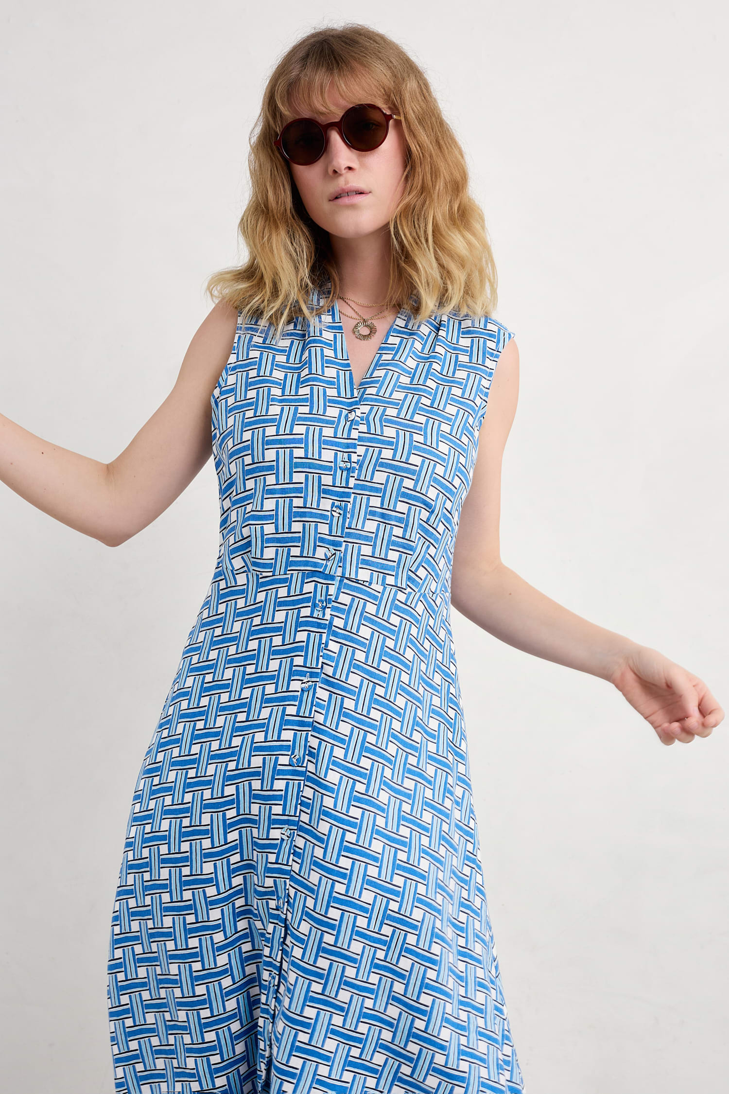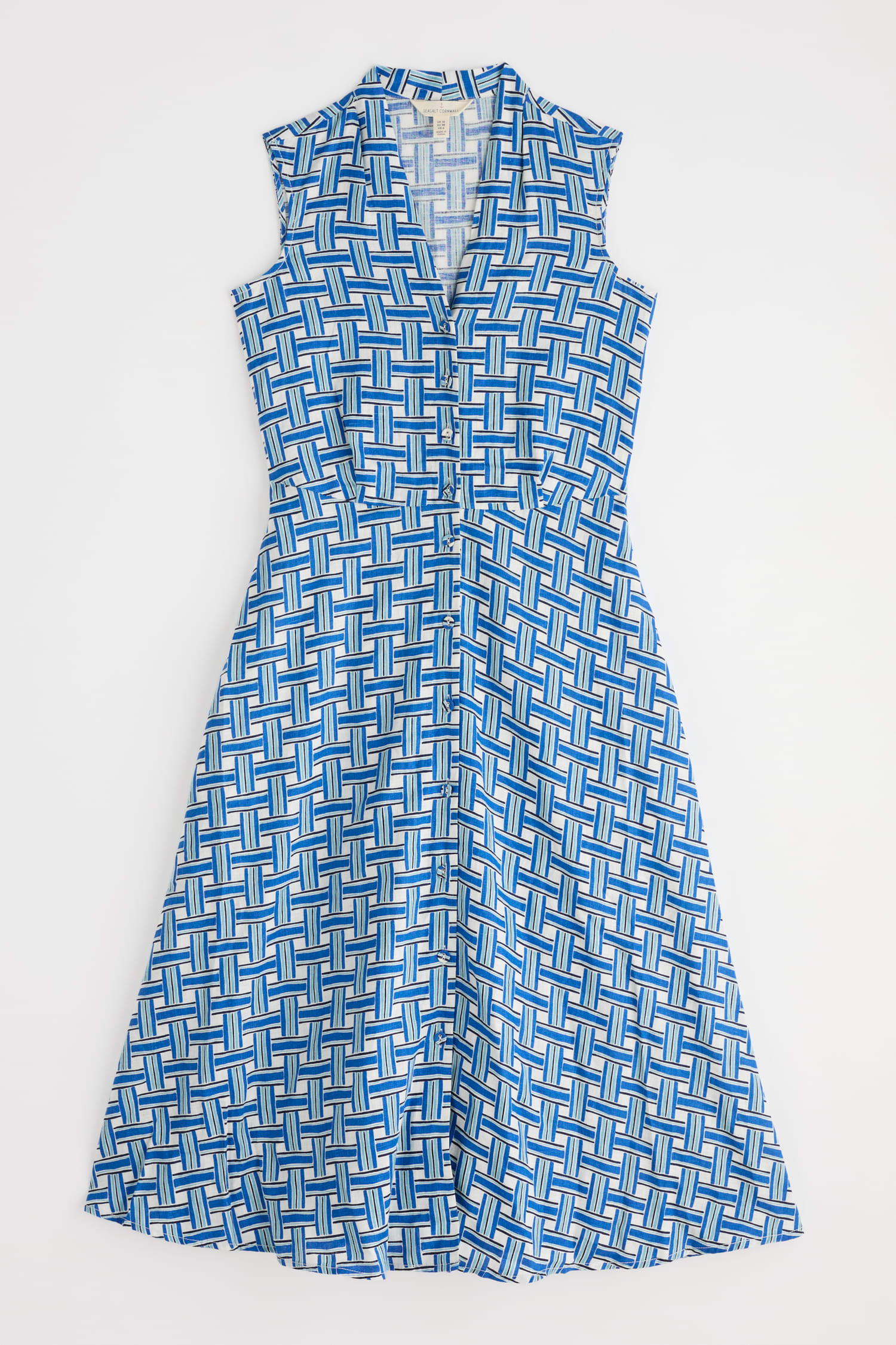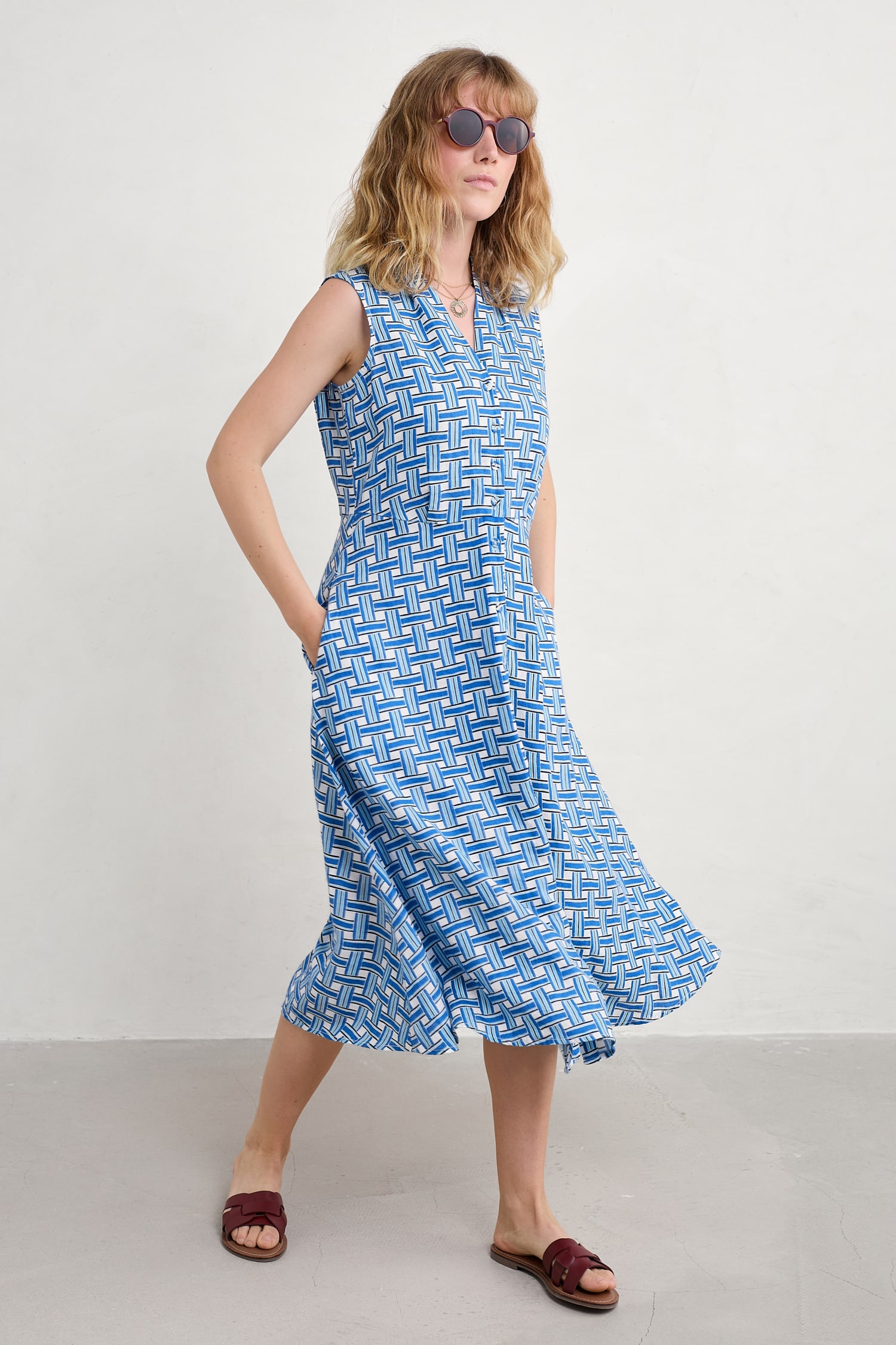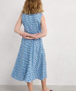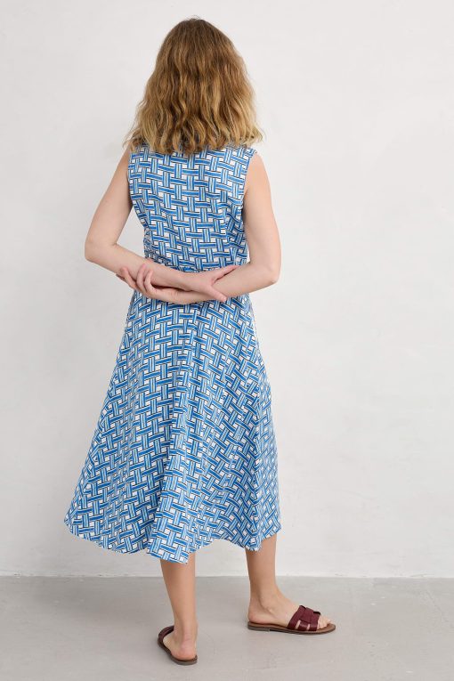 The sleeveless edition of our Carved Wood Dress, made from cool and breathable linen. Inspired by vintage-style shirtwaisters, the midi-length dress has a flattering cut with a deep waistband and under-bust pleats for shaping. The tailored bodice opens out into a full skirt, finished with a pair of in-seam pockets. A smart V-neckline and fabric-covered buttons complete the forties’ feel.