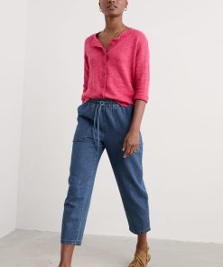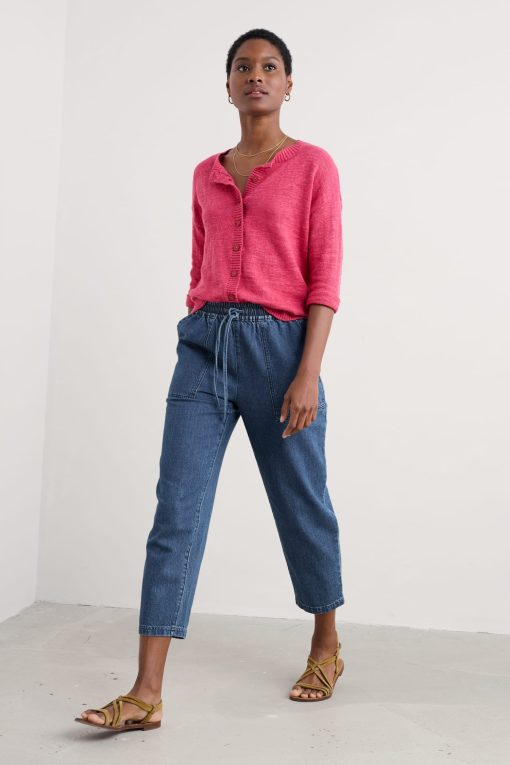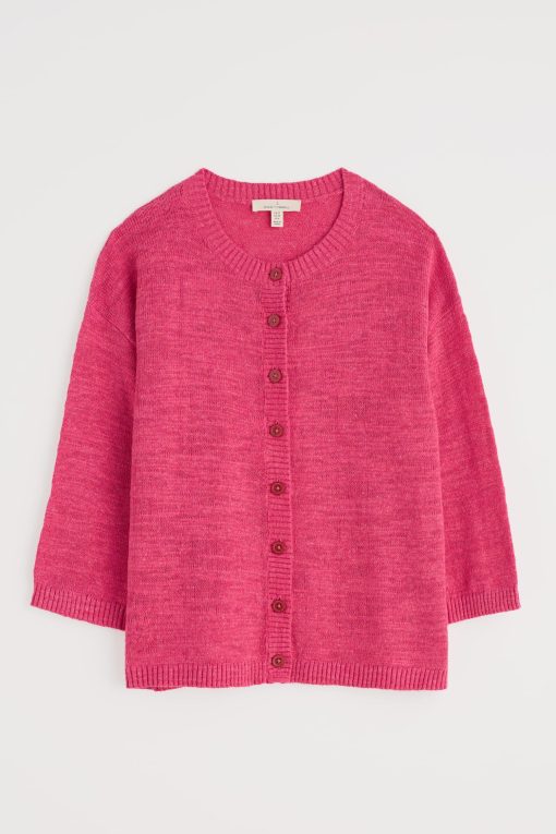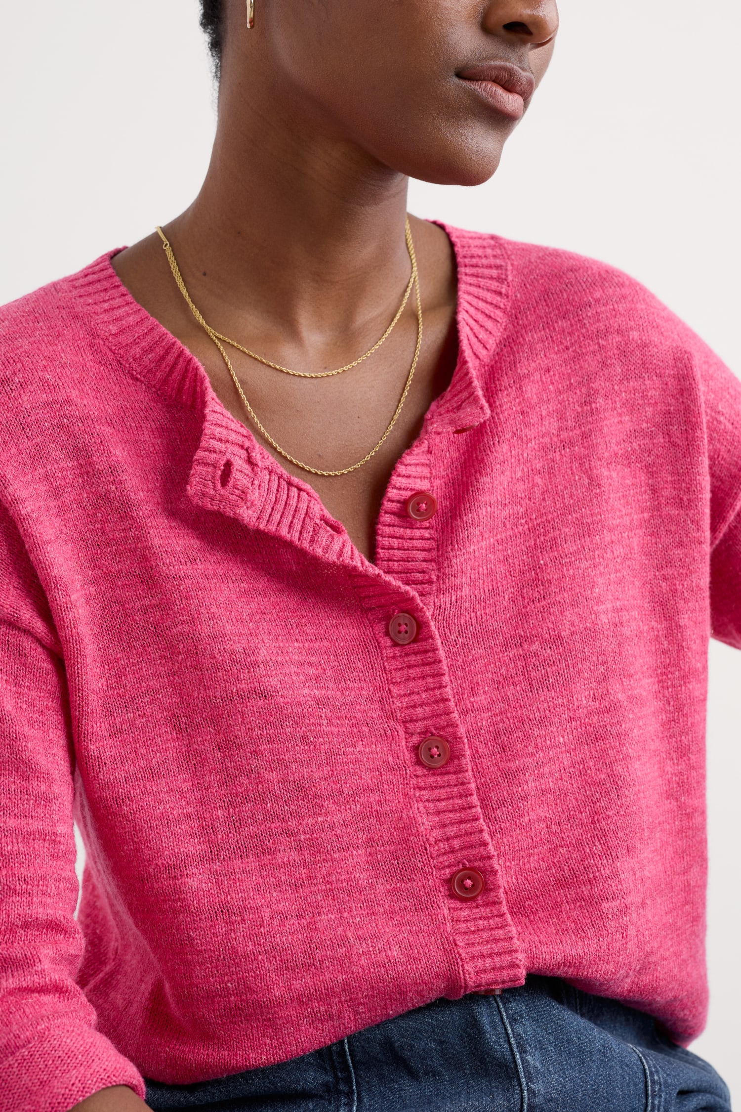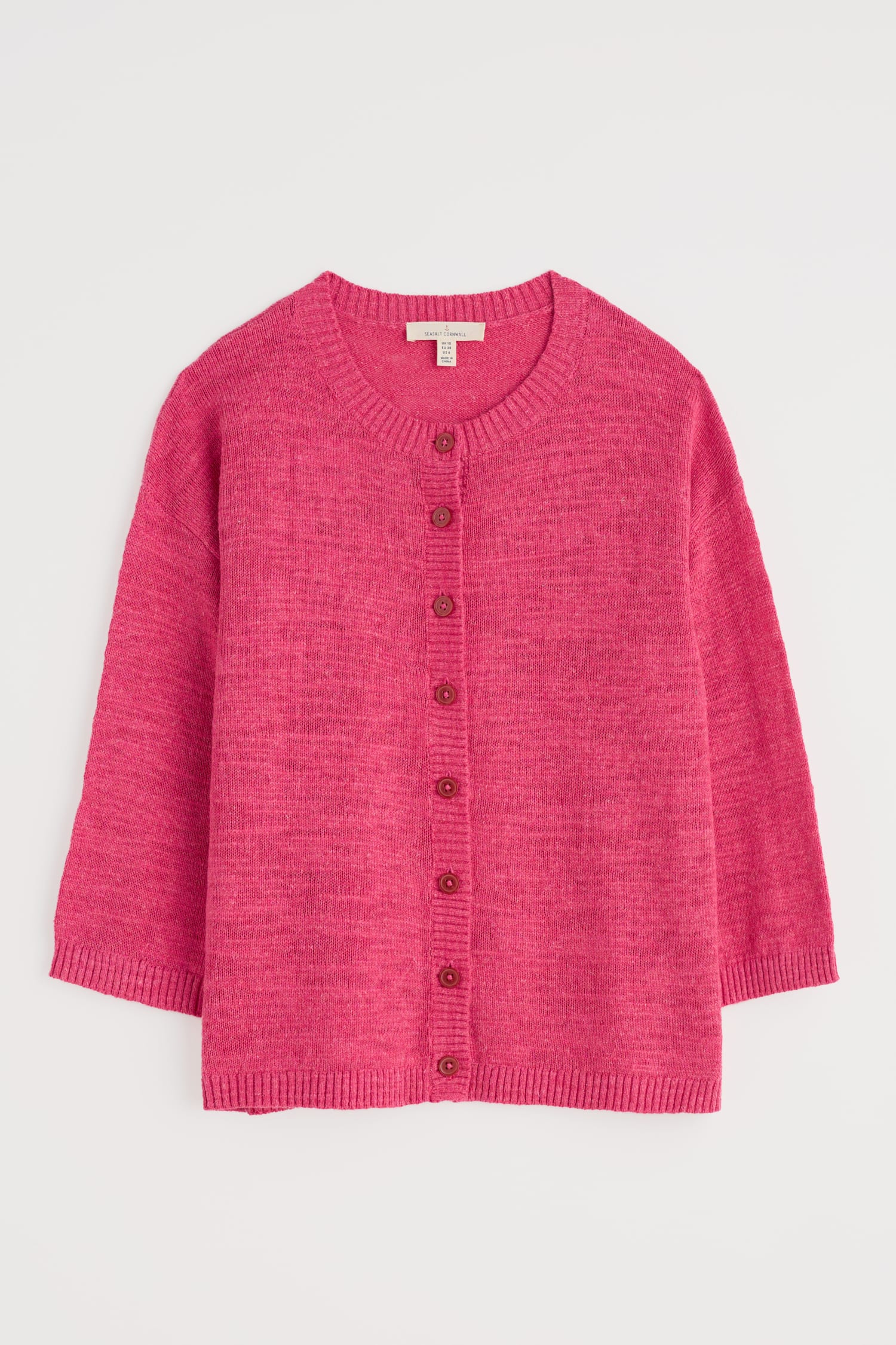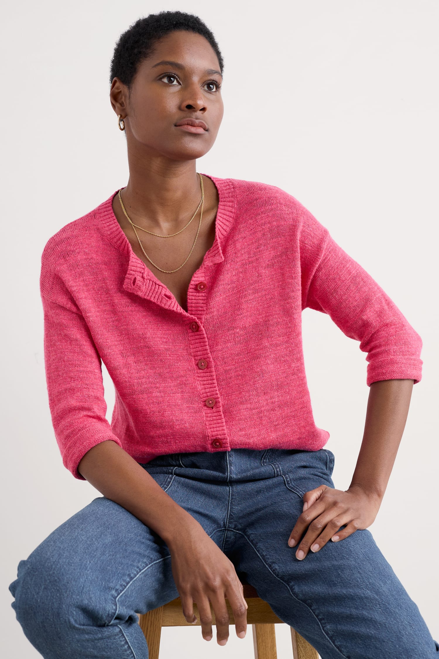 A classic button-through cardigan, knitted from a soft blend of organic cotton and linen fibres. It has an easy fit through the body, with dropped shoulders for a relaxed feel and 3/4 length sleeves. Ribbed trims at the round neck, cuffs and hem bring a neat finishing touch.