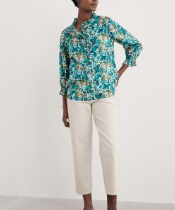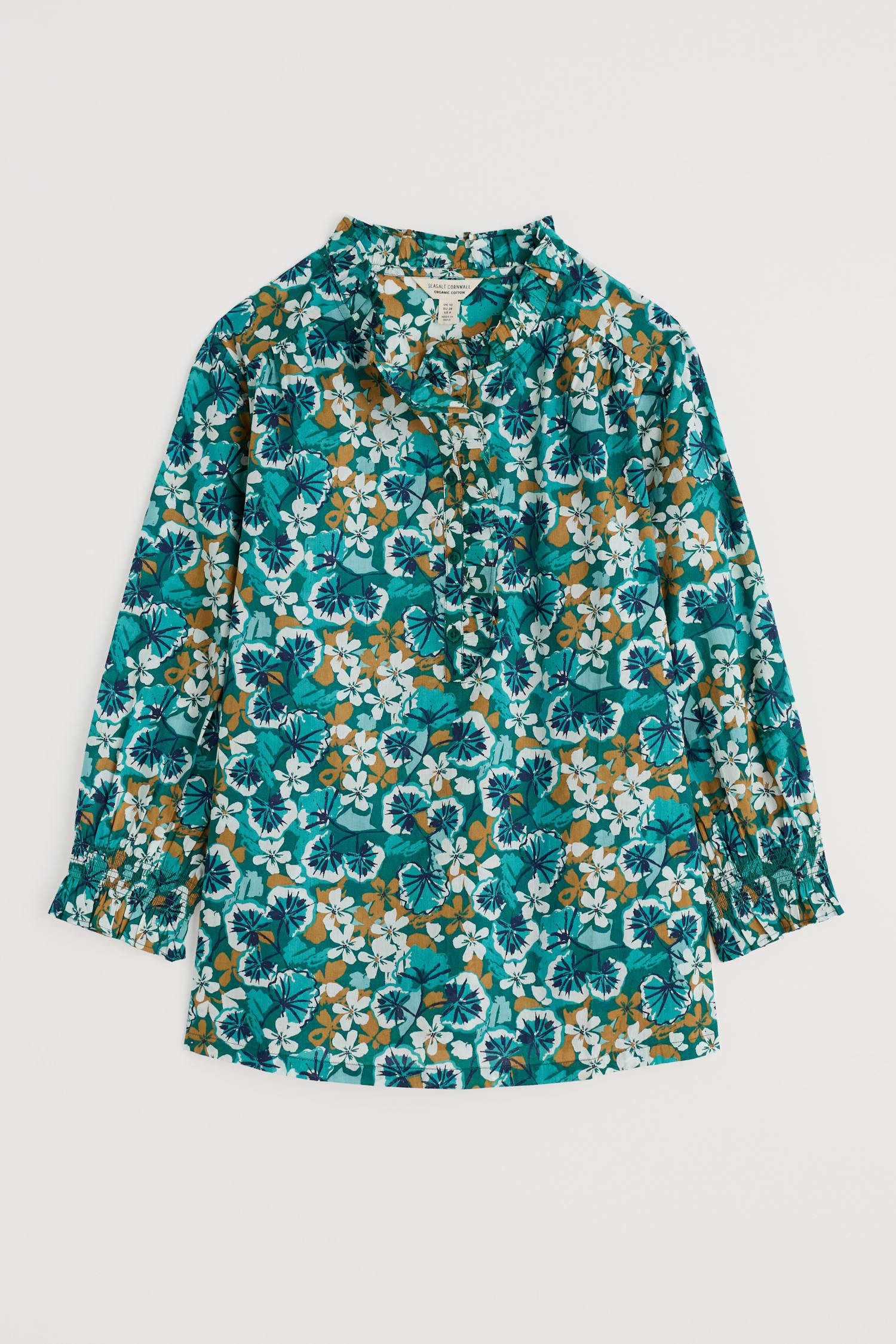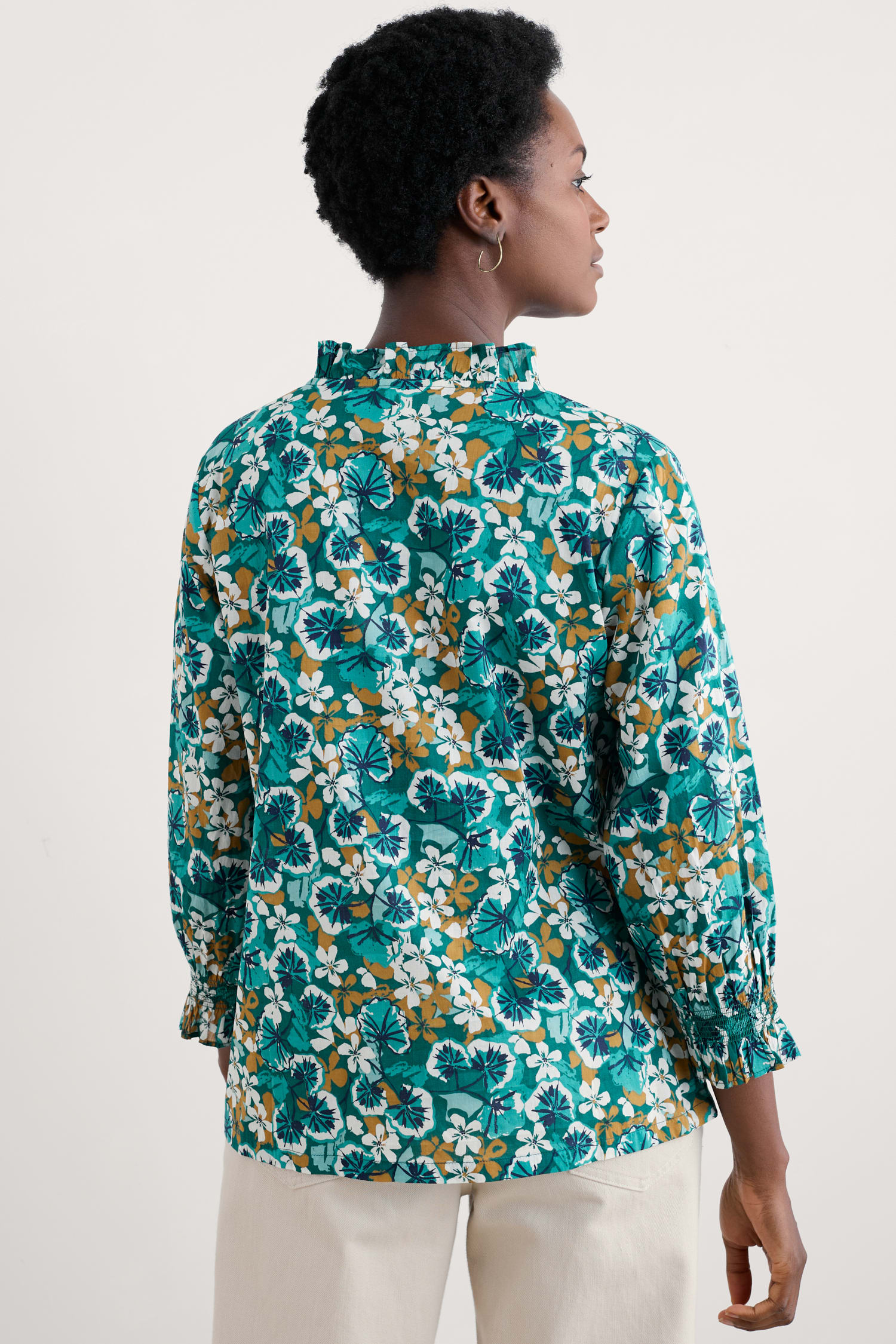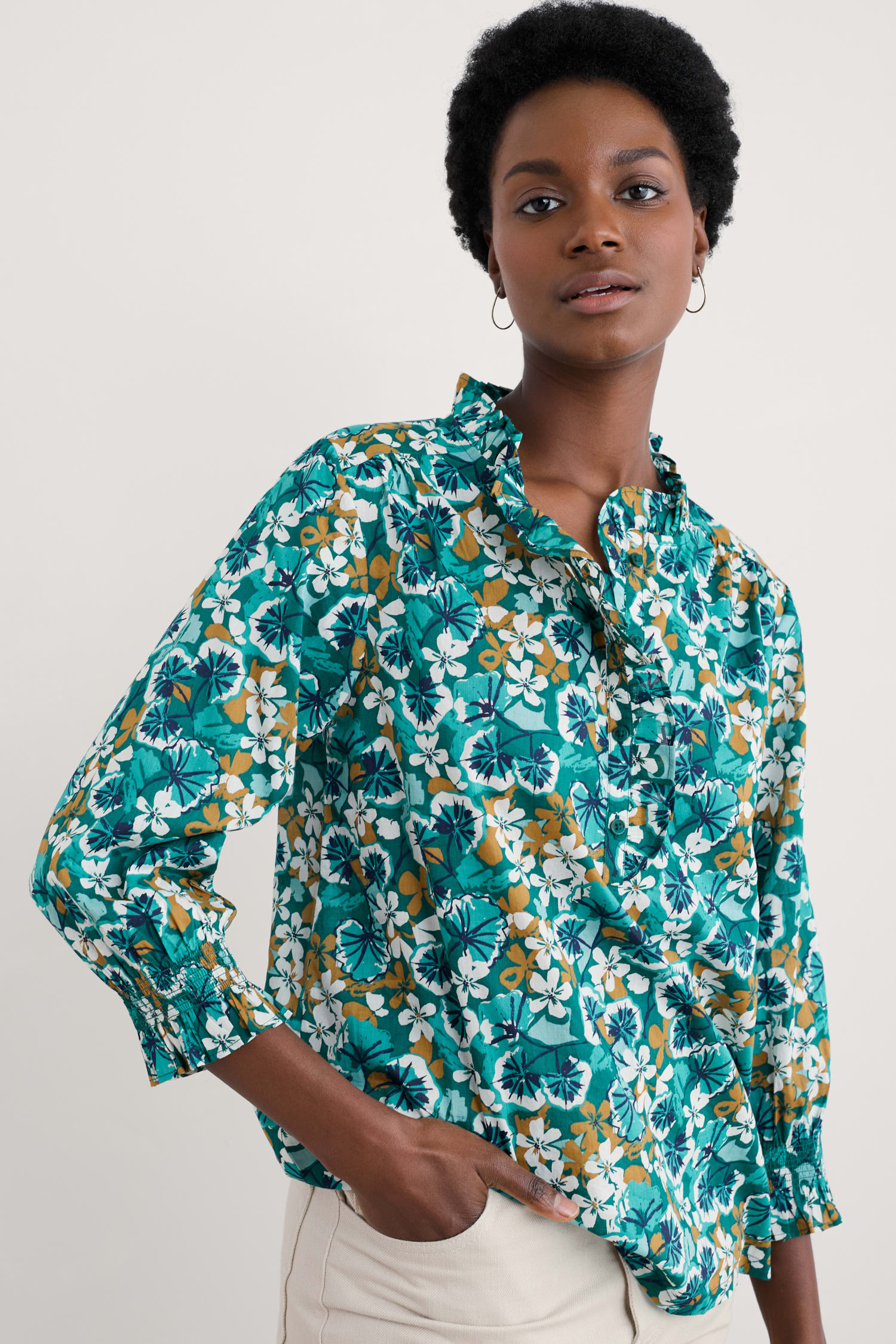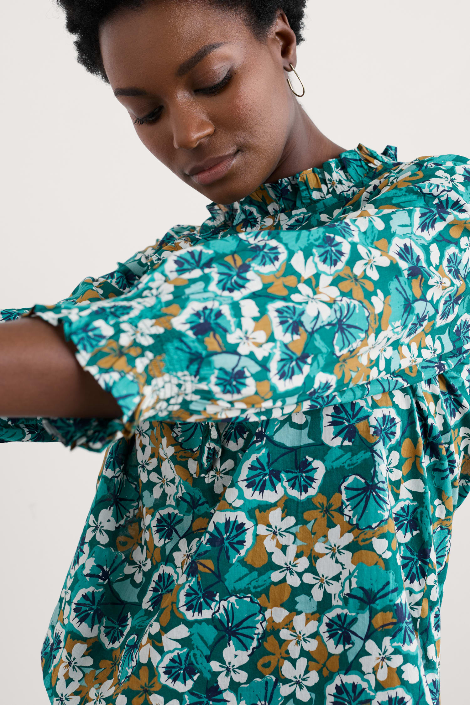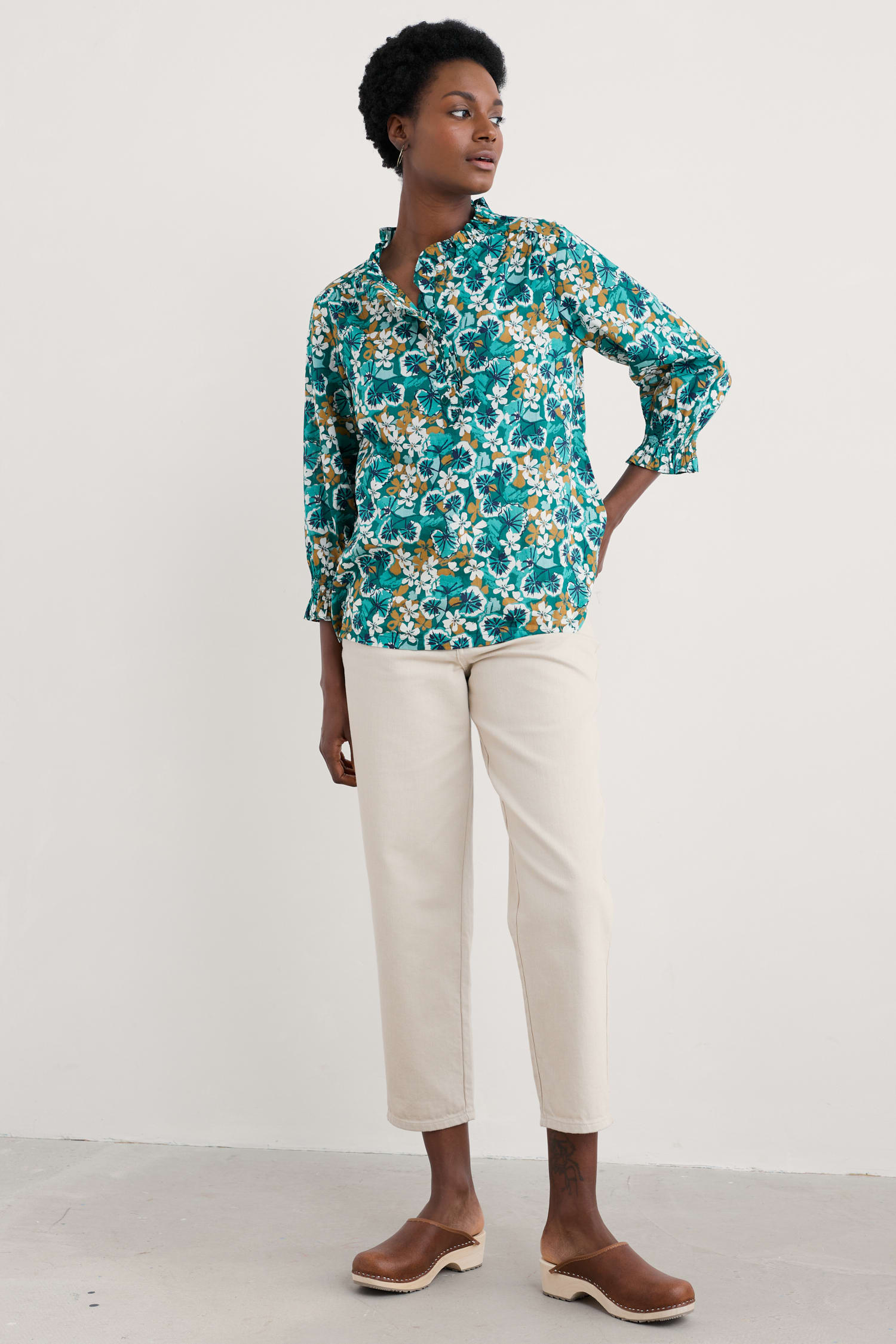 An easy-wearing take on a classic blouse, crafted from GOTS-certified organic cotton. Soft gathers give the blouse a relaxed shape, complemented by gently full, 3/4 length sleeves. Pretty frills around the neck and buttoned placket match those on the smocked cuffs. Fans of our Feather Star Top will recognise the fit of this lovely new piece.